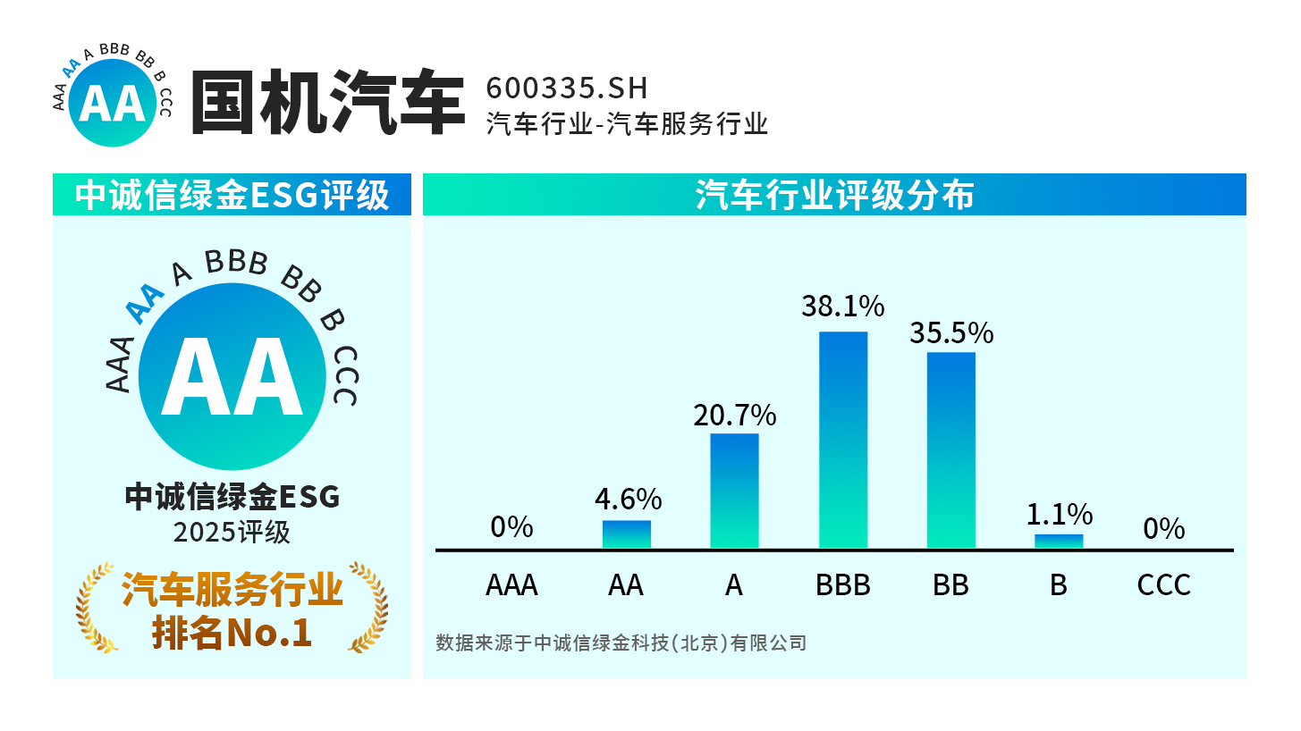 近日,國機汽車股份有限公司(證券代碼:600335.SH),榮獲所在行業中誠信綠金ESG最高評級AA,躋身上市公司前4%行列,彰顯公司在環境、社會和治理(ESG)領域的卓越表現與顯著進步。中誠信綠金是中國領先的ESG評級機構,構建了一套深度融合本土實踐與國際規范的評級體系,其將A...